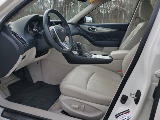 This Vehicle is nicely equipped with the following features: Essential Package (3.0t LUXE) (60/40 Split-Folding Rear Seats, Driver Seat Power Lumbar, Heated Front Seats, Heated Steering Wheel, and Remote Engine Start), 18 x 7.5 Aluminum Alloy Wheels, 6 Speakers, Alloy wheels, Apple CarPlay/Android Auto, Automatic temperature control, Front dual zone A/C, Front reading lights, Leather Shift Knob, Leather steering wheel, Navigation System, Power moonroof, Radio data system, Radio: INFINITI InTouch w/AM/FM/HD/CD, 4-Wheel Disc Brakes, ABS brakes, Air Conditioning, AM/FM radio: SiriusXM, Auto-dimming Rear-View mirror, Blind Spot Warning, Brake assist, Bumpers: body-color, CD player, Compass, Delay-off headlights, Driver door bin, Driver vanity mirror, Dual front impact airbags, Dual front side impact airbags, Electronic Stability Control, Four wheel independent suspension, Front anti-roll bar, Front Bucket Seats, Front Center Armrest, Front fog lights, Fully automatic headlights, Garage door transmitter: HomeLink, Heated door mirrors, Illuminated entry, Leatherette Seating Surfaces, Literature Kit, Low tire pressure warning, Occupant sensing airbag, Outside temperature display, Overhead airbag, Overhead console, Panic alarm, Passenger door bin, Passenger vanity mirror, Power door mirrors, Power driver seat, Power passenger seat, Power steering, Power windows, Premium Paint, Rain sensing wipers, Rear anti-roll bar, Rear reading lights, Rear seat center armrest, Rear window defroster, Remote keyless entry, Security system, Speed control, Speed-Sensitive Wipers, Splash Guards, Steering wheel mounted audio controls, Tachometer, Telescoping steering wheel, Tilt steering wheel, Traction control, Trip computer, Turn signal indicator mirrors, and Variably intermittent wipers.
