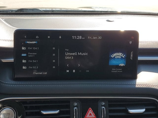 This Vehicle is nicely equipped with the following features: Option Group 01, 6 Speakers, Alloy wheels, AM/FM radio: SiriusXM, Android Auto & Apple CarPlay, Radio: AM/FM/SiriusXM/HD Audio System, Wheels: 19 x 8.0J Fr & 19 x 8.5J Rr Alloy, 4-Wheel Disc Brakes, ABS brakes, Air Conditioning, Anti-whiplash front head restraints, Auto High-beam Headlights, Auto-dimming Rear-View mirror, Automatic temperature control, Brake assist, Bumpers: body-color, Delay-off headlights, Driver door bin, Driver vanity mirror, Dual front impact airbags, Dual front side impact airbags, Electronic Stability Control, Emergency communication system: Genesis Connected Services, Exterior Parking Camera Rear, Four wheel independent suspension, Front anti-roll bar, Front Bucket Seats, Front Center Armrest, Front dual zone A/C, Front reading lights, Fully automatic headlights, Garage door transmitter: HomeLink, Heated door mirrors, Heated front seats, Heated Multi-Adjustable Front Bucket Seats, Illuminated entry, Knee airbag, Leatherette Seating Surfaces, Low tire pressure warning, Navigation System, Occupant sensing airbag, Outside temperature display, Overhead airbag, Overhead console, Panic alarm, Passenger door bin, Passenger vanity mirror, Power door mirrors, Power driver seat, Power passenger seat, Power steering, Power windows, Rear anti-roll bar, Rear reading lights, Rear seat center armrest, Rear window defroster, Remote keyless entry, Security system, Speed control, Speed-Sensitive Wipers, Split folding rear seat, Steering wheel mounted audio controls, Tachometer, Telescoping steering wheel, Traction control, Trip computer, Turn signal indicator mirrors, and Variably intermittent wipers.