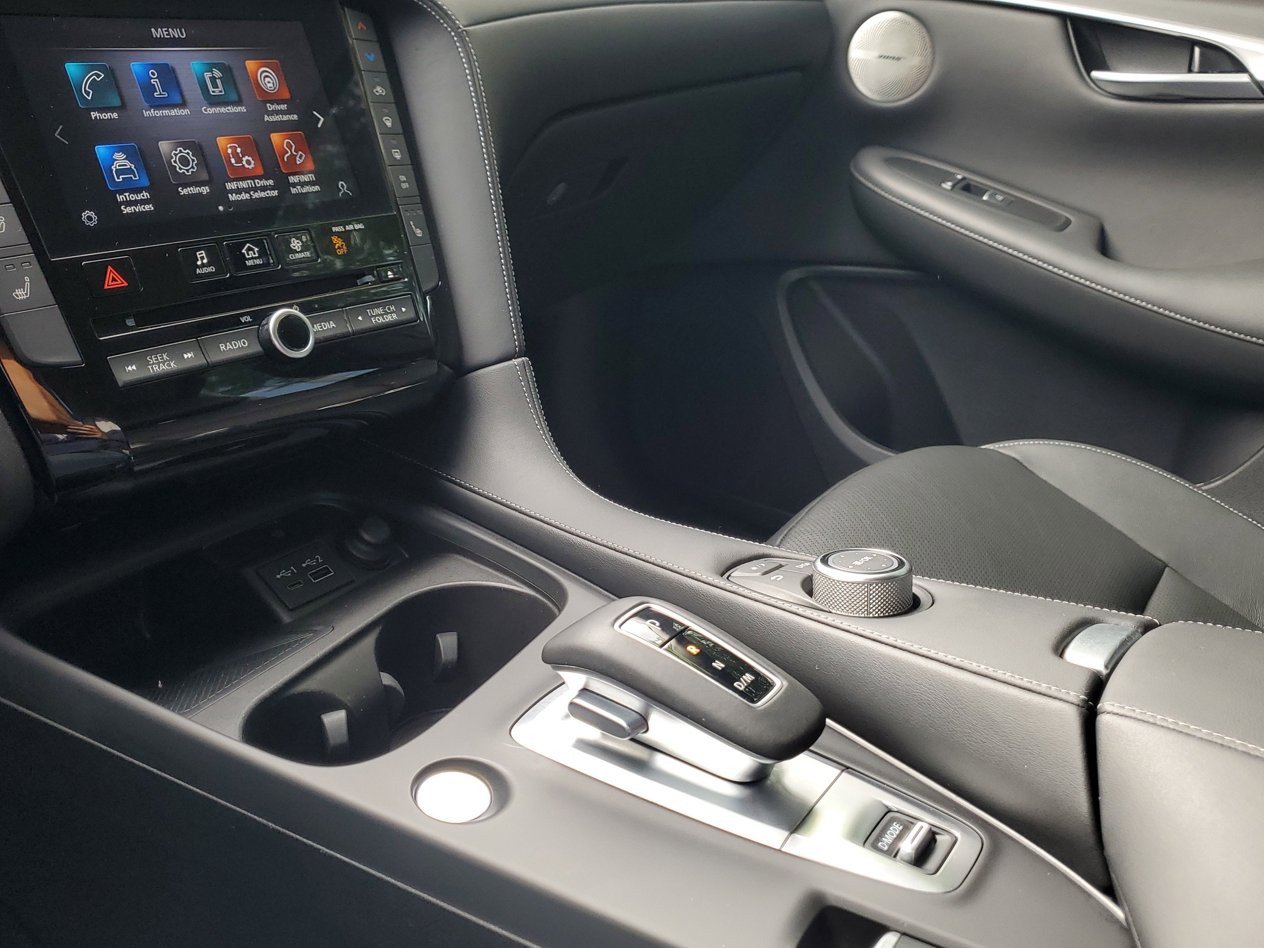 - Radio: HD Audio System -inc: INFINITI InTouch, INFINITI InTouch services, INFINITI InTouch dual display system w/upper 8" and lower 7" HD touch screens, wireless Apple CarPlay, Android Auto, HD radio technology, SiriusXM radio w/advanced audio features and 90-day complimentary trial, INFINITI voice recognition, Siri Eyes Free, Wi-Fi hotspot and active noise cancellation