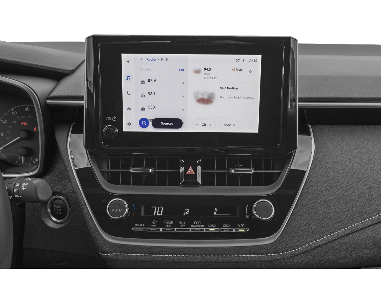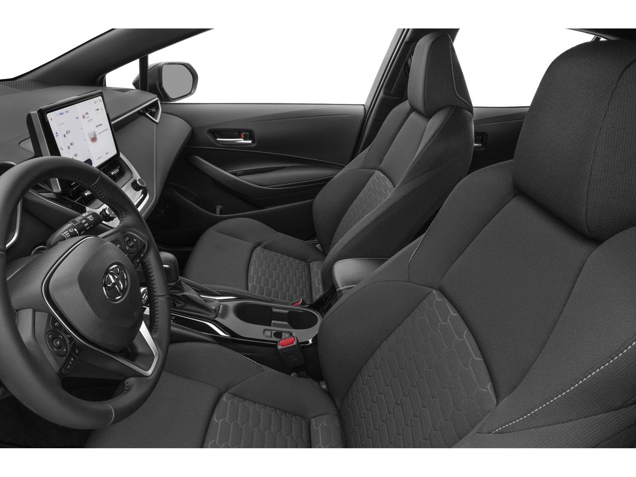 This Vehicle is nicely equipped with the following features: 4-Wheel Disc Brakes, 6 Speakers, ABS brakes, Air Conditioning, Alloy wheels, AM/FM radio: SiriusXM, Auto High-beam Headlights, Automatic temperature control, Brake assist, Bumpers: body-color, Compass, Delay-off headlights, Driver door bin, Driver vanity mirror, Dual front impact airbags, Dual front side impact airbags, Electronic Stability Control, Emergency communication system: Safety Connect (up to 10-year trial subscription), Exterior Parking Camera Rear, Fabric Seat Trim, Four wheel independent suspension, Front anti-roll bar, Front Bucket Seats, Front Center Armrest, Front reading lights, Heated door mirrors, Illuminated entry, Knee airbag, Leather Shift Knob, Leather steering wheel, Low tire pressure warning, Occupant sensing airbag, Outside temperature display, Overhead airbag, Overhead console, Panic alarm, Passenger door bin, Passenger vanity mirror, Power door mirrors, Power steering, Power windows, Radio data system, Radio: 8 Toyota Audio Multimedia, Rear anti-roll bar, Rear seat center armrest, Rear side impact airbag, Rear window defroster, Rear window wiper, Remote keyless entry, Security system, Speed control, Speed-sensing steering, Split folding rear seat, Spoiler, Sport Front Seats, Steering wheel mounted audio controls, Tachometer, Telescoping steering wheel, Tilt steering wheel, Traction control, Trip computer, Turn signal indicator mirrors, and Variably intermittent wipers.