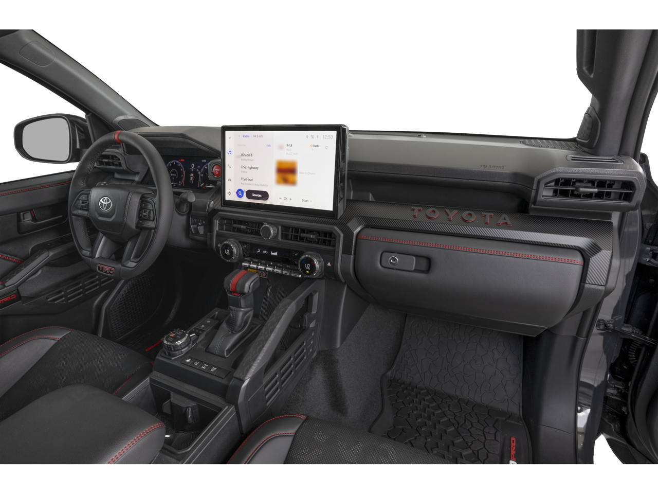 This vehicle comes equipped with: 2.4L I4 PDI Hybrid Turbocharged DOHC 16V, ABS brakes, Active Cruise Control, Alloy wheels, Electronic Stability Control, Front dual zone A/C, Heated door mirrors, Heated front seats, Illuminated entry, Low tire pressure warning, Navigation System, Power moonroof, Remote keyless entry, Traction control, 3.583 Axle Ratio, 4-Wheel Disc Brakes, 9 Speakers, Air Conditioning, AM/FM radio: SiriusXM, Anti-whiplash front head restraints, Apple CarPlay/Android Auto, Auto High-beam Headlights, Auto-dimming Rear-View mirror, Automatic temperature control, Brake assist, Bumpers: body-color, Driver door bin, Driver vanity mirror, Dual front impact airbags, Dual front side impact airbags, Emergency communication system: Safety Connect (1-year trial), Exterior Parking Camera Rear, Four wheel independent suspension, Front anti-roll bar, Front Bucket Seats, Front Center Armrest, Front fog lights, Front reading lights, Fully automatic headlights, Garage door transmitter: HomeLink, Heads-Up Display, Heated steering wheel, Htd & Vent TRD Pro IsoDynamic Performance Seats, JBL Premium Audio, Knee airbag, Leather Shift Knob, Leather steering wheel, Navigation system: Drive Connect (1 year trial) includes Cloud Navigation with real time traffic and Google POI, Occupant sensing airbag, Outside temperature display, Overhead airbag, Overhead console, Panic alarm, Passenger door bin, Passenger vanity mirror, Power door mirrors, Power driver seat, Power passenger seat, Power steering, Power windows, Radio: 14 Toyota Audio Multimedia, Rear anti-roll bar, Rear step bumper, Rear window defroster, Security system, SofTex Seat Trim, Speed control, Speed-sensing steering, Split folding rear seat, Steering wheel mounted audio controls, Tachometer, Telescoping steering wheel, Tilt steering wheel, Trip computer, Turn signal indicator mirrors, Variably intermittent wipers, Ventilated front seats, and Wheels: 18 Black TRD Pro Alloy.