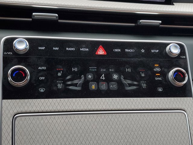 This Vehicle is nicely equipped with the following features: Option Group 01, 18 Speakers, 3rd row seats: split-bench, 4-Wheel Disc Brakes, ABS brakes, Adaptive suspension, Air Conditioning, Alloy wheels, AM/FM radio: SiriusXM, Anti-whiplash front head restraints, Auto High-beam Headlights, Auto tilt-away steering wheel, Auto-dimming door mirrors, Auto-dimming Rear-View mirror, Automatic temperature control, Brake assist, Bumpers: body-color, Cargo Net, Compass, Delay-off headlights, Driver door bin, Driver vanity mirror, Dual front impact airbags, Dual front side impact airbags, Electronic Stability Control, Emergency communication system: Genesis Connected Services, Exterior Parking Camera Rear, First Aid Kit, Four wheel independent suspension, Front and Rear Mudguards, Front anti-roll bar, Front Bucket Seats, Front Center Armrest, Front dual zone A/C, Front reading lights, Fully automatic headlights, Garage door transmitter: HomeLink, Genuine wood console insert, Genuine wood dashboard insert, Genuine wood door panel insert, Heads-Up Display, Heated and Ventilated Front Bucket Seats, Heated door mirrors, Heated front seats, Heated rear seats, Heated steering wheel, Illuminated entry, Knee airbag, Leather steering wheel, Low tire pressure warning, Memory seat, Nappa Leather Seating Surfaces, Navigation System, NFC Key Card, Occupant sensing airbag, Outside temperature display, Overhead airbag, Overhead console, Panic alarm, Passenger door bin, Passenger vanity mirror, Power door mirrors, Power driver seat, Power Liftgate, Power moonroof, Power passenger seat, Power steering, Power windows, Radio data system, Radio: AM/FM/HD Bose Premium Sound System, Rain sensing wipers, Rear air conditioning, Rear anti-roll bar, Rear reading lights, Rear seat center armrest, Rear side impact airbag, Rear window defroster, Rear window wiper, Reclining 3rd row seat, Remote keyless entry, Roadside Assistance Kit, Security system, Speed control, Speed-sensing steering, Speed-Sensitive Wipers, Split folding rear seat, Spoiler, Steering wheel memory, Steering wheel mounted audio controls, Tachometer, Telescoping steering wheel, Tilt steering wheel, Traction control, Trip computer, Turn signal indicator mirrors, Variably intermittent wipers, Ventilated front seats, Ventilated rear seats, and Wheels: 22 x 9.5J Dark Gray Matte Alloy.